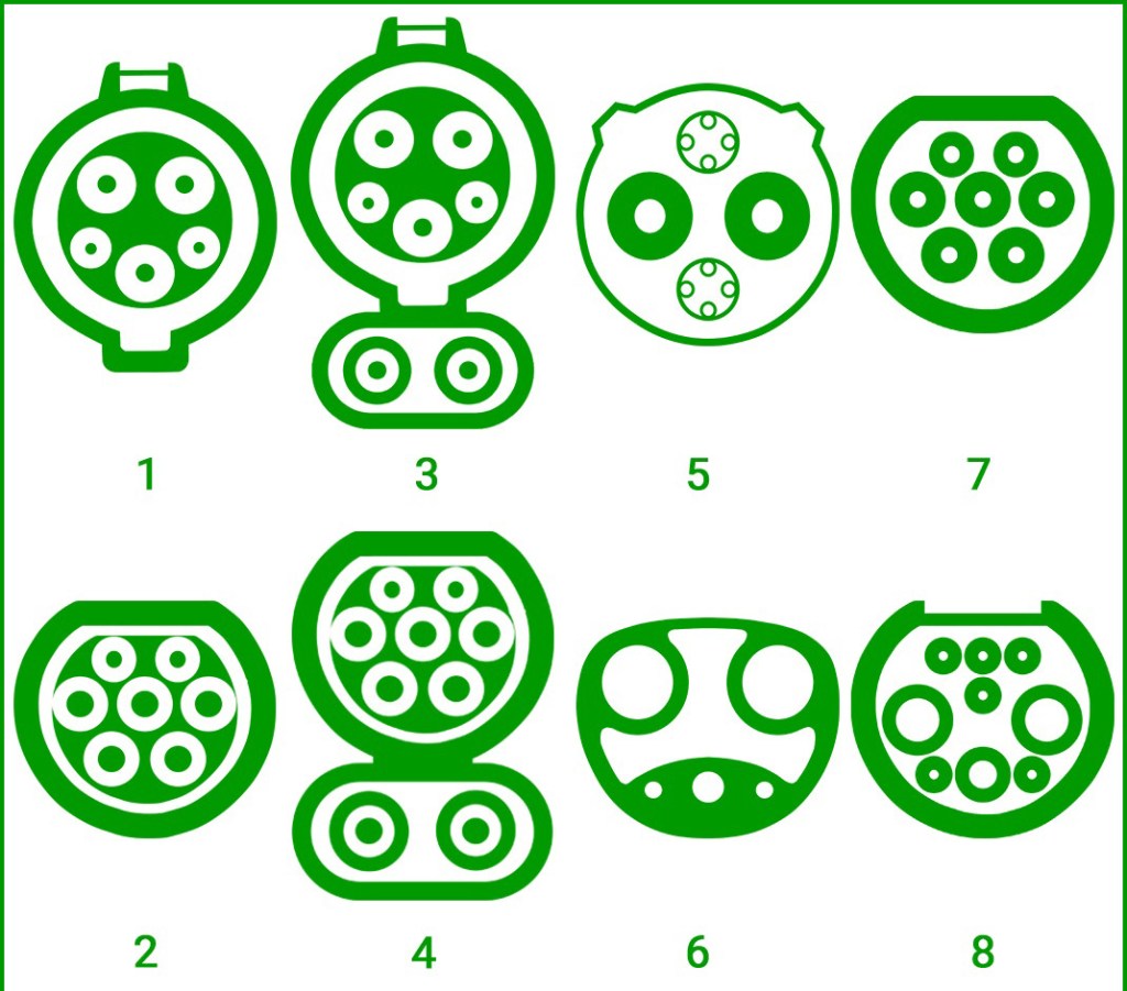 Повільна зарядка (AC): 1. Type 1 J1772 (США/Японія) 2. Type 2 Mennekes (Європа) 7. GB/T (Китай)